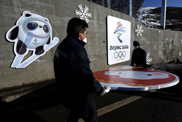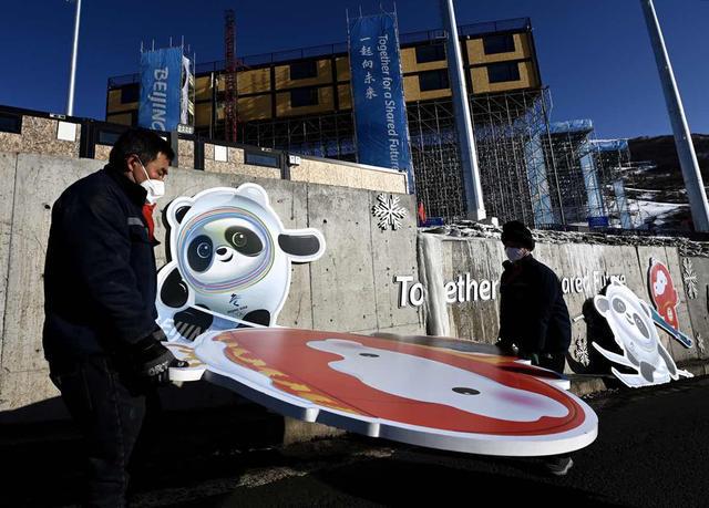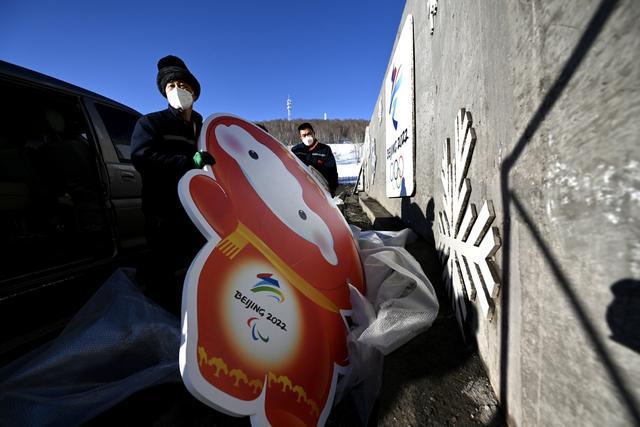 2月25日,张家口云顶滑雪公园,工作人员准备张贴冬残奥会吉祥物“雪容融”的图案标志。中国日报记者 魏晓昊 摄