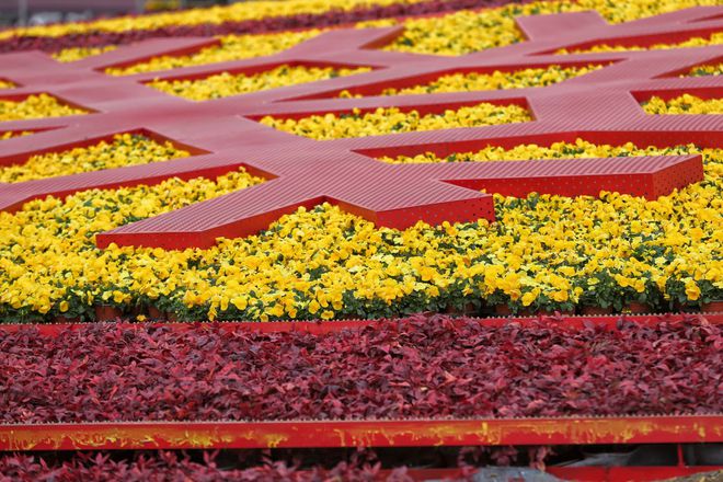 北京冬奥会落下帷幕后,天安门广场“精彩冬奥”花坛、长安街沿线、专机楼及机场高速路、八角桥、延庆妫川广场等地共9组立体花坛,开始进行景观布置转换。原花坛中使用的彩色有机覆盖物,被14万株鲜花替代。这是北京首次于2月底在室外大规模应用耐寒花卉布置花坛。
