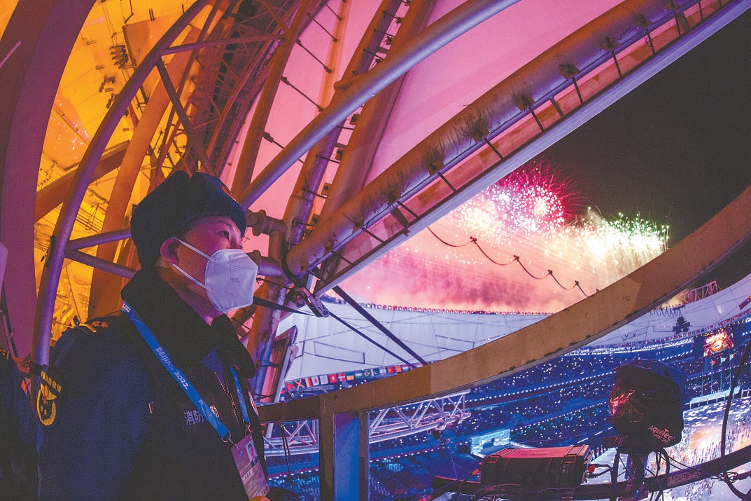 烟花漫天,生命绽放。3月4日晚,北京2022年冬残奥会开幕式在国家体育场“鸟巢”盛大上演,璀璨的烟花再次在鸟巢上腾空而起,将北京的夜空点亮。在这些绝美画面的背后,北京市消防救援总队特勤支队派出的40人消防安保小组,坚定地“扎根”在鸟巢顶部,守护住了安全,也奉献出了精彩。