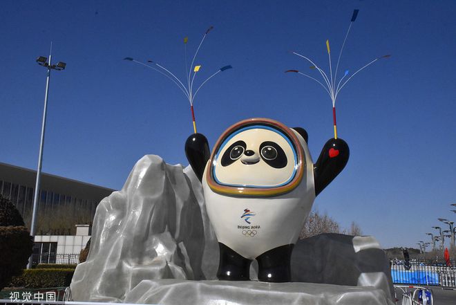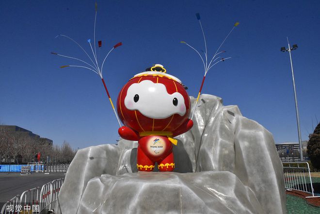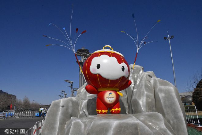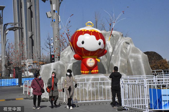 2022年3月5日,北京,游人在北京奥林匹克公园与北京冬残奥会吉祥物雪容融合影。随着北京冬残奥会的到来,每天都有许多游人在北京奥林匹克公园北端与北京冬残奥会吉祥物雪容融合影。