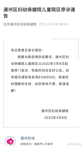 【北京#通州区妇幼保健院儿童院区暂停门急诊# 】3月8日,北京市通州区妇幼保健院发布公告称,根据当前疫情防控要求,通州区妇幼保健院儿童院区从2022年3月8日起暂停门急诊,恢复时间会及时公告。如有疑问请致电咨询81583000,感谢您的理解和支持,给您带来不便,敬请谅解!