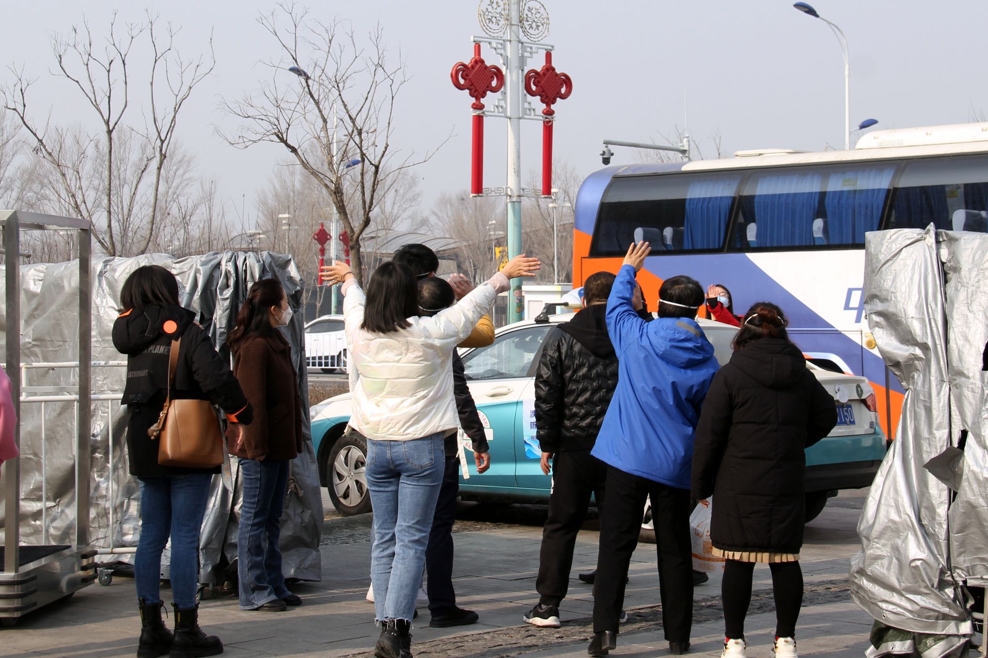 首批解封志愿者来到停车场,将行李搬上客车,即将踏上回家旅程。延庆区供图