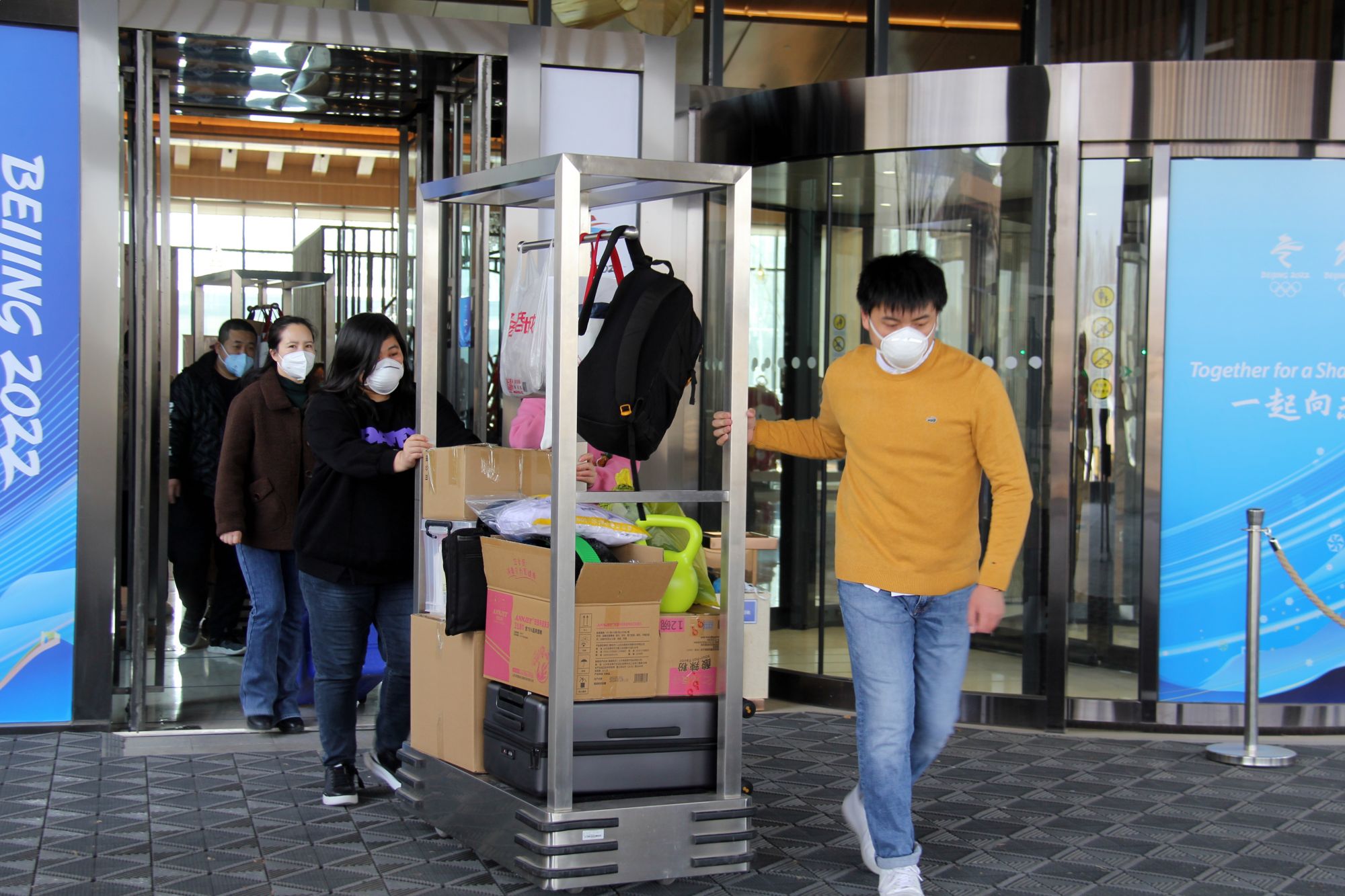 在北京世园凯悦酒店的大厅,一批驻店小组的工作人员正推着行李陆陆续续地走出酒店。前来接应的单位人员与他们拥抱并送上鲜花,庆祝他们圆满完成冬奥会期间的服务保障工作,祝贺他们即将与久别的家人相见。