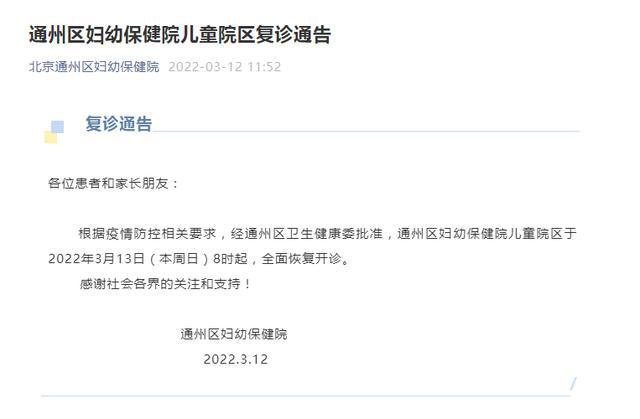 据北京通州区妇幼保健院微信公众号消息,根据疫情防控相关要求,经通州区卫生健康委批准,通州区妇幼保健院儿童院区于2022年3月13日(本周日)8时起,全面恢复开诊。