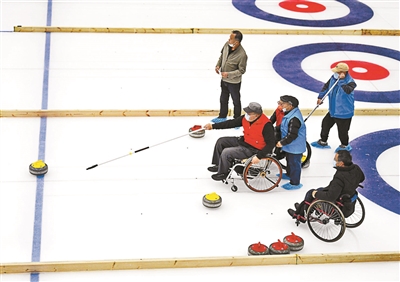 北京青年报记者了解到,考虑到残疾人出行不便及北京市冰场、雪场适合残疾人使用器材匮乏且受气候影响大、可供时间短等因素,近年来,北京市残联联合高等院校和爱心企业研发推出了一批适合残疾人广泛参与的模拟冰雪项目,如旱地冰壶、仿冰面室内冰蹴球、冰上融合龙舟等残疾人冬季群体项目,有计划有组织地下沉到各区及全市温馨家园,指导各区冰雪活动科学有序地进行。东城区旱地冰壶队就是由此而生。成立于2017年的东城区残疾人旱地冰壶队目前有15人,分为聋人组、智力组和肢体组,实行队长负责制,每周在东城区残疾人活动中心训练一次。