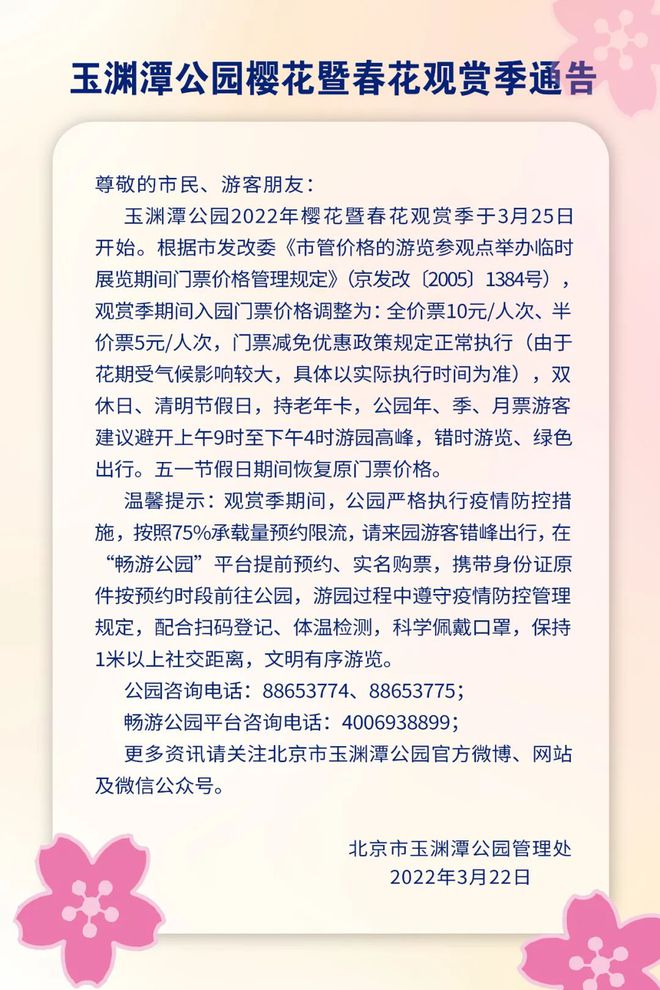 3月22日,北京市玉渊潭公园管理处发布《玉渊潭公园樱花暨春花观赏季通告》,玉渊潭公园2022年樱花暨春花观赏季于3月25日开始。