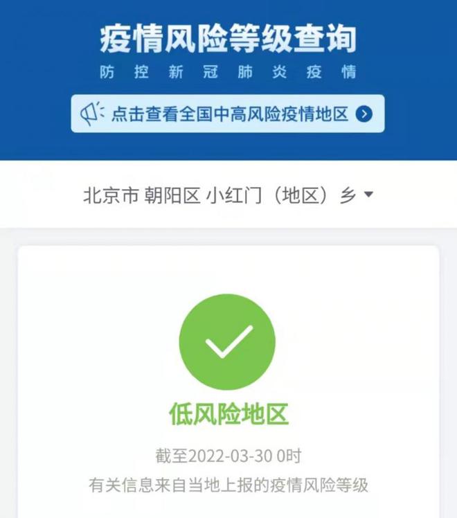 3月30日零时,国务院客户端小程序疫情风险等级查询显示,北京朝阳区小红门乡肖村已经由中风险区调整为低风险区。