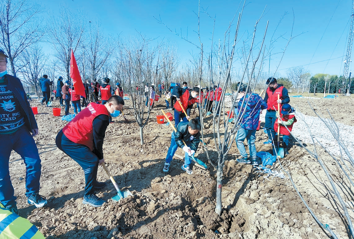 义务植树不仅要“大地植绿”,更要实现“心中播绿”,尤其在青少年心中撒下生态文明的种子。在城市副中心的张家湾公园,1700多名市民不仅栽植了1100余株梅花、白皮松、海棠等,还给树涂白、给鸟儿挂巢,并亲手修建旱溪、搭建本杰士堆,助力创森。在平谷文化公园,孩子们现场向游客宣讲植树造林知识,和父母一起挖树坑、做围堰、给树苗浇水。在顺义共青林场,20组家庭体验植绿护绿。