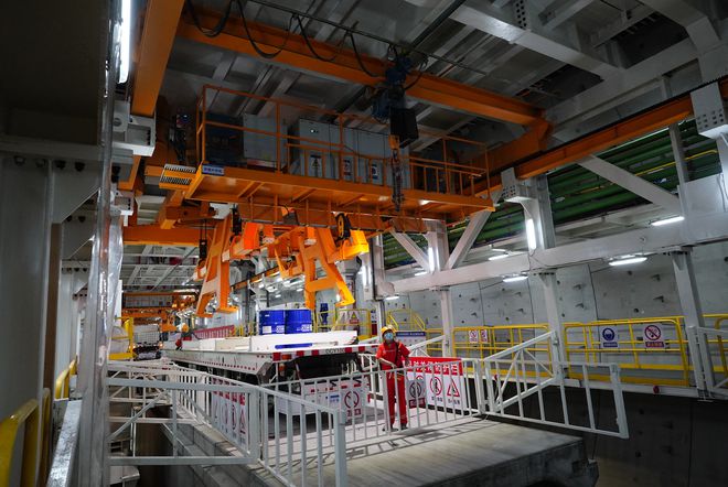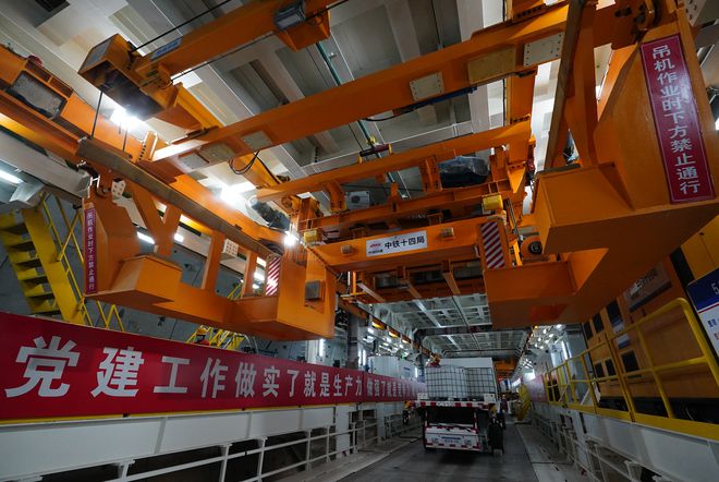 11日下午,记者在京华号盾构机尾部看到,吊机正吊起平板车上运来的一块块混凝土管片,运往盾构机前方。
