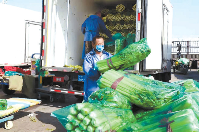 在新发地市场,商户正在卸载刚运来的新鲜芹菜。