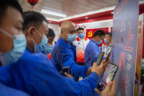 工人正在扫码下载事先录制好的有声书。人民网记者 翁奇羽摄