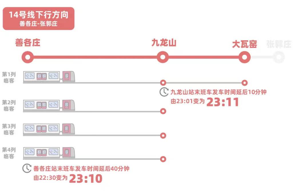 14号线上行方向张郭庄至善各庄区段将增加1列临客,张郭庄站末班车发车时间由原来的22:30变为22:40,延后10分钟,共计覆盖33个车站(张郭庄站到善各庄站)。