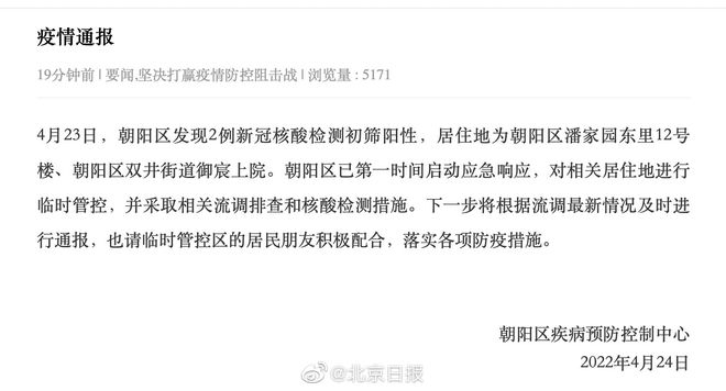 4月23日,朝阳区发现2例新冠核酸检测初筛阳性,居住地为朝阳区潘家园东里12号楼、朝阳区双井街道御宸上院。朝阳区已第一时间启动应急响应,对相关居住地进行临时管控,并采取相关流调排查和核酸检测措施。下一步将根据流调最新情况及时进行通报,也请临时管控区的居民朋友积极配合,落实各项防疫措施。