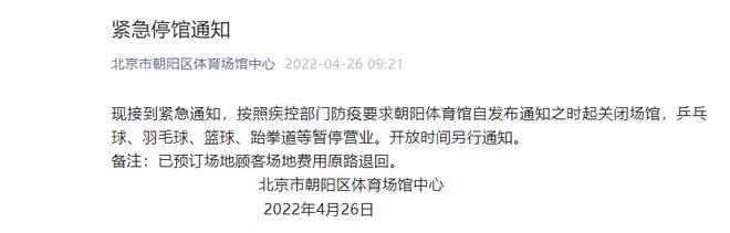 4月26日,北京市朝阳区体育馆发布消息,现接到紧急通知,按照疾控部门防疫要求,朝阳体育馆自发布通知之时起关闭场馆,乒乓球、羽毛球、篮球、跆拳道等暂停营业。开放时间另行通知。已预订场地顾客,场地费用原路退回。