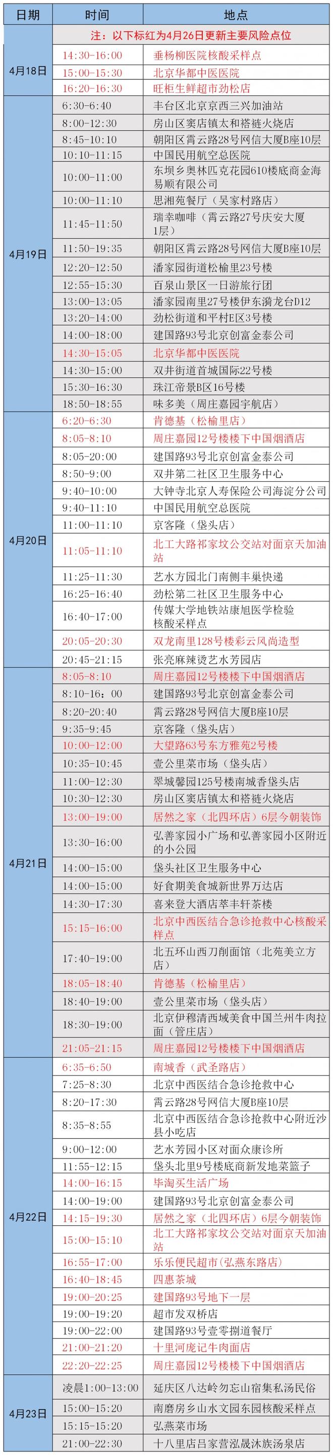 4月26日,朝阳区疾病预防控制中心发布消息,本市近日突发数起疫情,涉及多条传播链,续发和隐匿传播风险高,情况紧急,形势严峻。根据疫情防控要求,请与下列轨迹有时空交集或近期接到健康宝弹窗提示的人员,立即主动向所在社区(村)、工作单位、居住酒店报告,或者拨打朝阳疾控部门热线电话87789709报告。