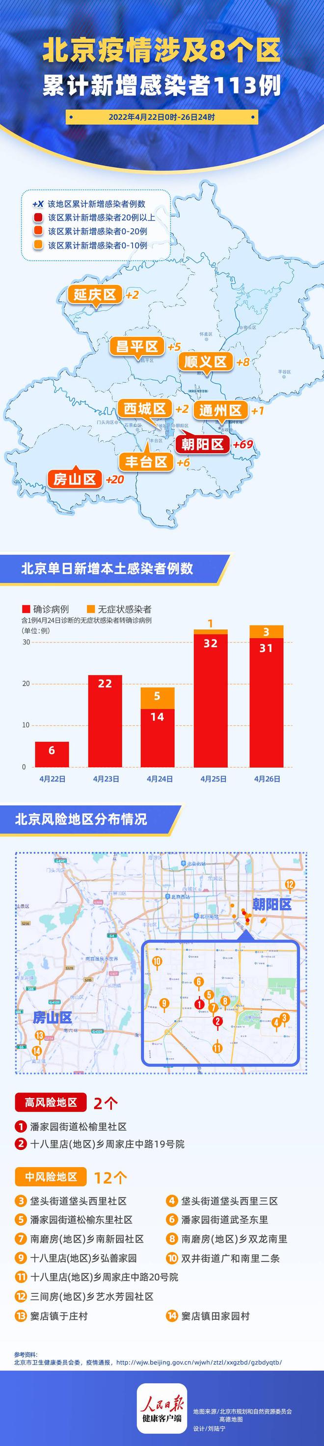4月22日至4月26日,北京市累计报告105例新冠肺炎确诊病例,涉及京内8区。其中,朝阳区67例、房山区20例、顺义区8例、西城区2例、昌平区5例,丰台区5例、通州区1例、延庆区2例。初步流调结果显示,目前疫情已隐匿传播一周,涉及学校、旅行团及多个家庭,短期内出现了多代病例。