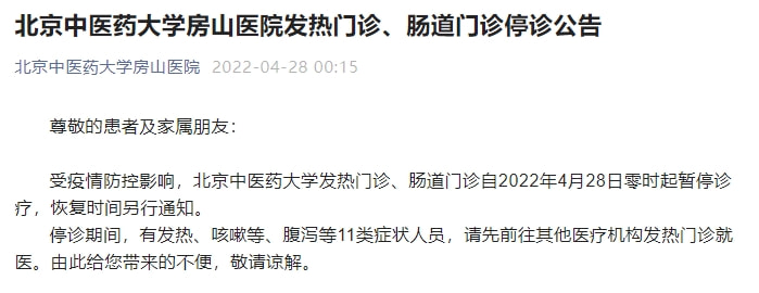 (原标题:北京中医药大学房山医院发热门诊、肠道门诊停诊)