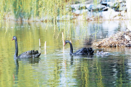 3月29日,圆明园九州景区后湖里,一对黑天鹅宝宝成功孵化,两只小天鹅立即成为圆明园新宠,吸引了众多摄影爱好者前来拍摄。黑天鹅一家在湖中时而静静游动,时而将头扎进水中觅食,映衬着一湖碧水和如烟的拂柳,构成一幅绝美的自然画面。湖边还有一只黑天鹅正在孵蛋育雏,周边放置的警戒线帮助黑天鹅安全育雏。游客们也只是远远地静静地看看,生怕惊扰了这“一家人”。