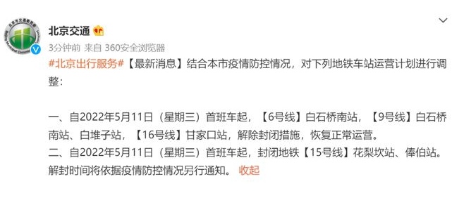 一、自2022年5月11日(星期三)首班车起,【6号线】白石桥南站,【9号线】白石桥南站、白堆子站,【16号线】甘家口站,解除封闭措施,恢复正常运营。