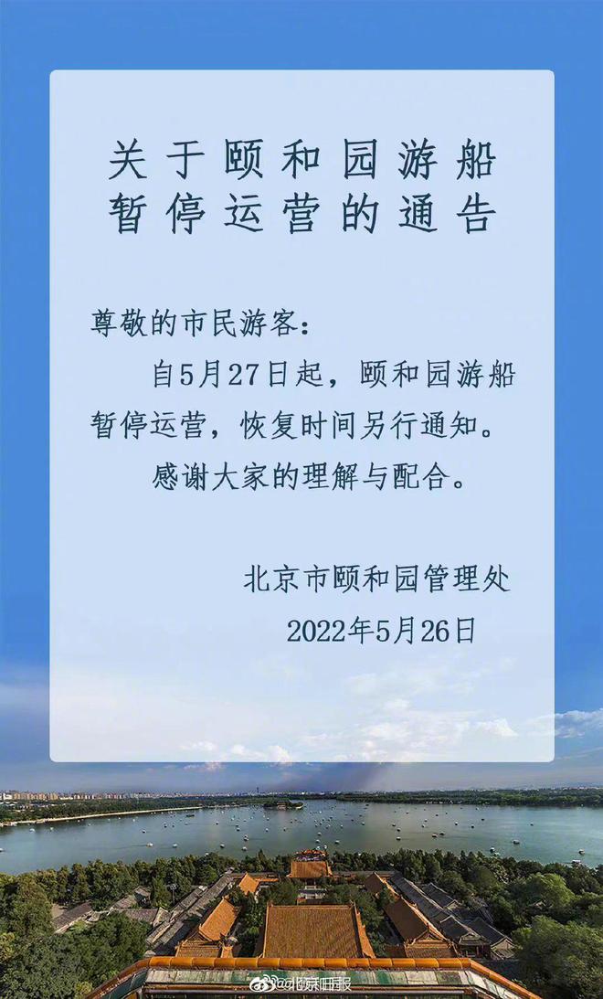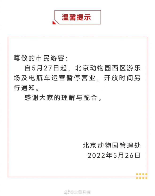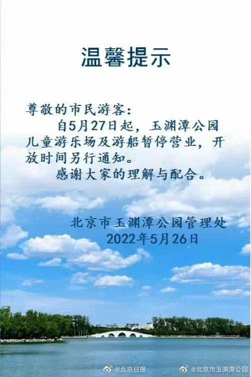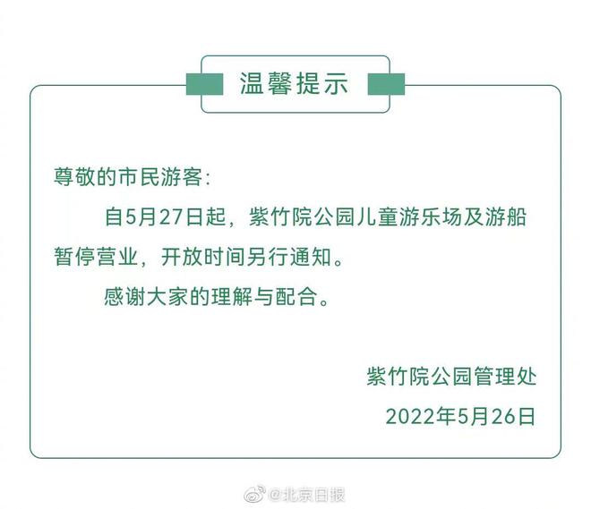 5月26日晚,多家市属公园发布提示,从5月27日起暂停游乐场及游船运营,开放时间另行通知。其中:紫竹院公园公园儿童游乐场及游船暂停营业;玉渊潭公园儿童游乐场及游船暂停营业;颐和园游船暂停运营;北海公园游船暂停营业;陶然亭公园儿童游乐场及游船暂停营业;北京动物园西区游乐场及电瓶车运营暂停营业。