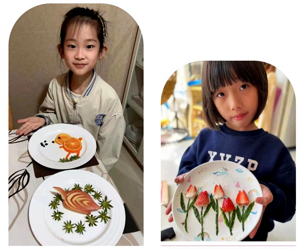 黑芝麻胡同小学学生展示和家长一起制作的水果拼盘