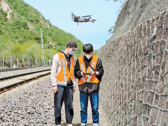 北京工务段职工利用无人机对高大山体等防洪处所进行隐患排查。