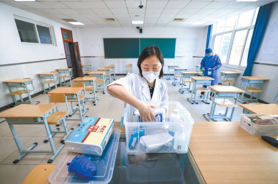 北京东直门中学考点,老师正在展示考场配备的防疫物品箱,箱内配备口罩、消毒酒精等防疫物品。 本报记者 潘之望摄