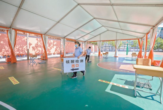 用红色遮阳棚搭建在操场上的室外休息区,下午考试结束后将变身核酸检测区。 本报记者 潘之望摄