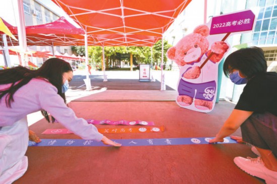 昨天上午,中国地质大学附属中学考点正在进行考点布置工作。两米线上除了疫情提示,还印有“沉着冷静 笑对高考”“自信认真 分分必得”等祝福语。本报记者 王海欣摄