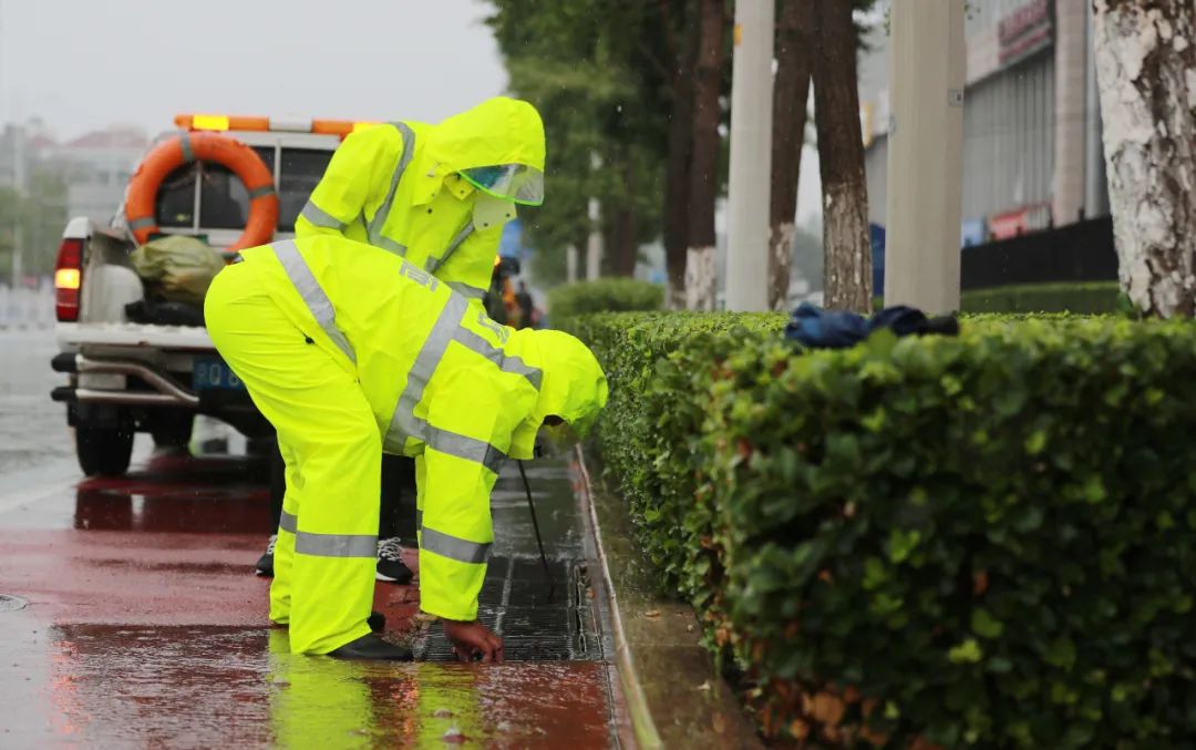 防汛人员根据道路积水情况,及时打开入河口和雨篦子,加大收水能力。