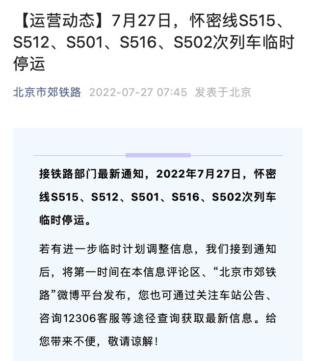 据北京市郊铁路官微消息,接铁路部门最新通知,2022年7月27日,怀密线S515、S512、S501、S516、S502次列车临时停运。