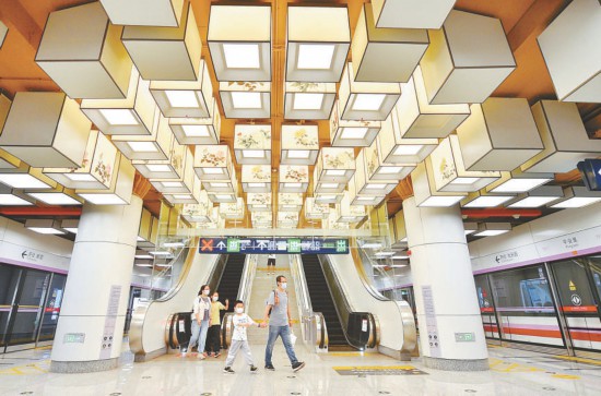 昨天,北京地铁19号线北太平庄站、平安里站、太平桥站、景风门站开通运营。在平安里站,古色古香的灯饰展示了中华传统文化和古都风韵。 本报记者 邓伟摄