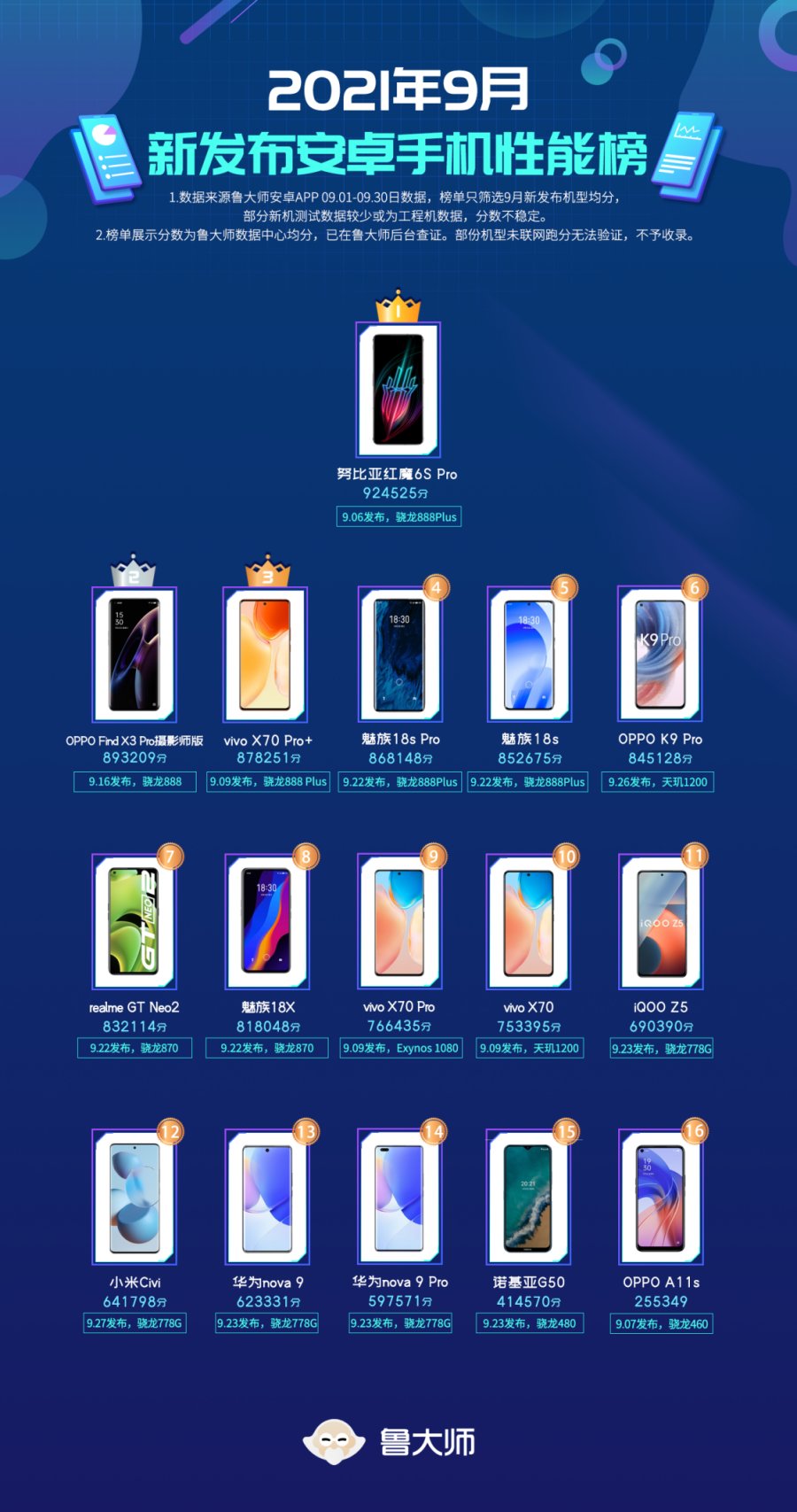 鲁大师数据中心公布了9月安卓新发布手机性能排行榜,数据来自鲁大师APP 09.01日-09.30日的数据,榜单只筛选在这期间新发布的机型。部分新机测试数据较少或为工程机数据,分数不稳定。