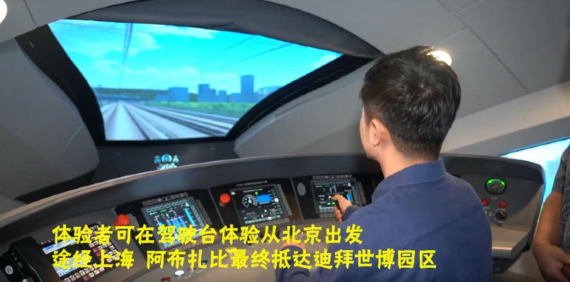 馆内,以复兴号模拟驾驶舱为代表的“中国高铁”展项备受瞩目。据了解,复兴号模拟驾驶舱按 1 比 1 的比例建造,参观者可在驾驶台体验从北京出发,途经上海、阿布扎比抵达迪拜世博园区的虚拟路线。