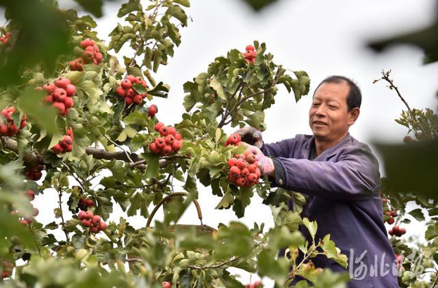 2021年10月19日,在河北省石家庄市晋州西贾庄村山楂种植园里,当地果农忙着采摘山楂。