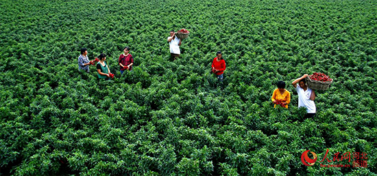 河北省鸡泽县万亩红辣椒专业合作社椒农正在采收成熟的辣椒。 李海涛摄