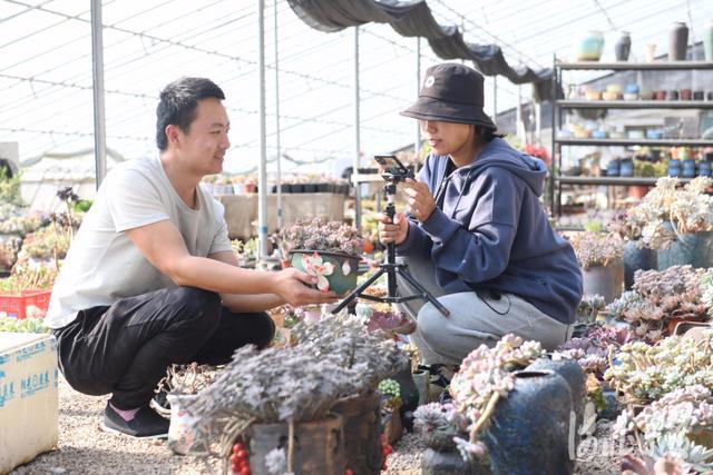 2021年11月3日,在河北省石家庄新乐市东杨家庄村花卉基地工作人员在直播介绍产品。通讯员贾敏杰摄影报道
