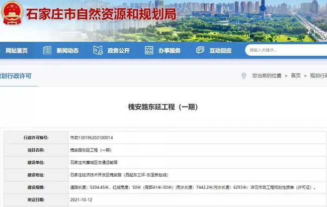 此次石家庄市自然资源和规划局发布的《槐安路东延工程(一期)建设工程规划许可证(市政类)》显示,槐安路东延工程(一期)的建设单位为“石家庄市藁城区交通运输局”,建设地址在“石家庄经济技术开发区槐安路(西起东三环-东至新赵线)”。该工程的建设规模为:道路长度5204.45米,红线宽度50米(局部41米-50米);雨水长度:7442.2米;污水长度:6293米。