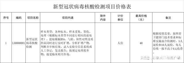 一、将新型冠状病毒核酸检测项目的最高限价由每人份60元调整为40元;5人混检和10人混检,最高限价统一调整为每人份8元(详见附件)。
