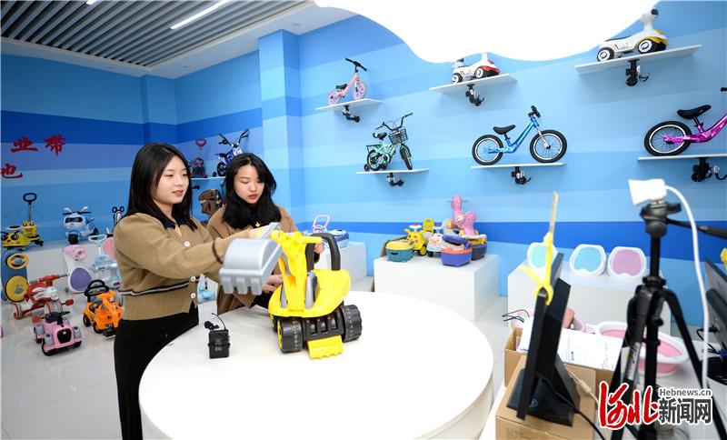 12月23日,平乡县童车玩具供应链直播基地员工在整理网络销售产品。