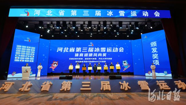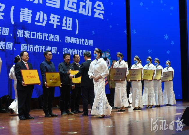2021年12月28日,河北省第三届冰雪运动会闭幕式在保定市涞源县举行。本届冰雪运动会共有82个代表团、5000多名运动员参加7个大项、342个小项的省级比赛,累计举办赛事活动3.8万余场次。图为闭幕式上颁奖现场。河北日报记者史晟全摄影报道