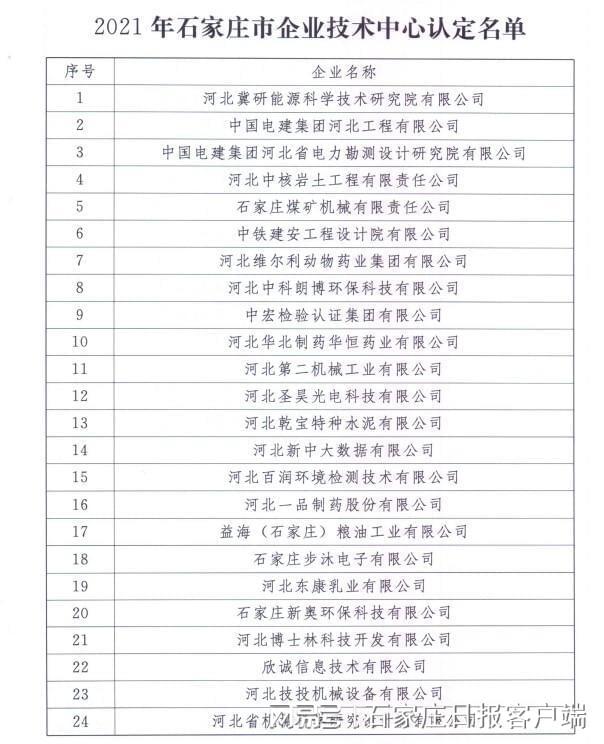 近日,石家庄市发改委、市科技局、市税务局等三部门联合发布了2021年市认定企业技术中心认定名单,河北冀研能源科学技术研究院有限公司等40家企业被认定为石家庄市企业技术中心。