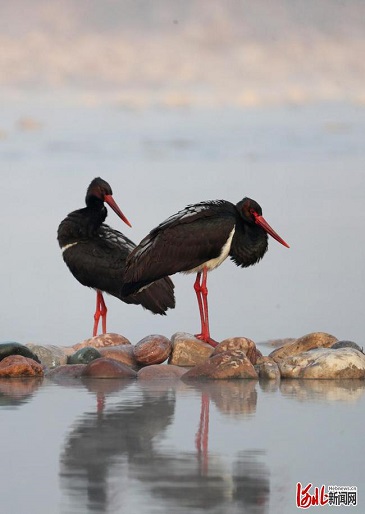 2022年1月8日,在河北省石家庄市井陉县绵蔓河,国家一级重点保护野生动物黑鹳在觅食。通讯员王保龙摄影报道