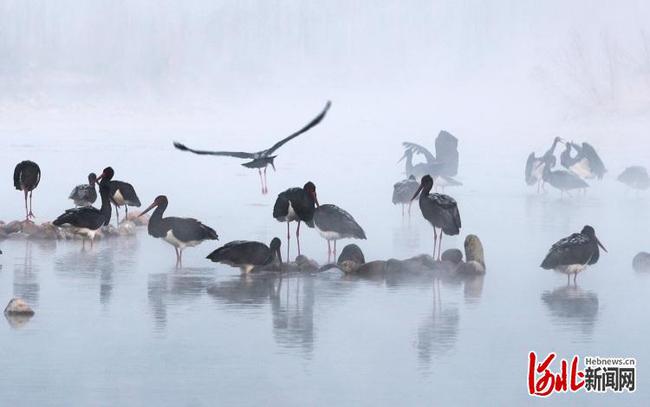 2022年1月8日,在河北省石家庄市井陉县绵蔓河,成群的黑鹳在栖息、觅食。通讯员王保龙摄影报道