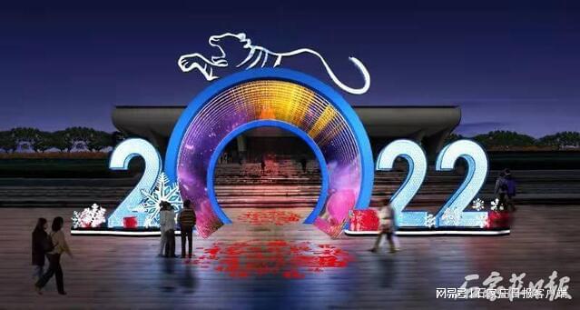在石家庄火车站西广场,记者看到施工人员正在打造金属质地、通体蓝色、具有“2022”字样的夜景小品。据夜景小品设计人员介绍,此次火车站西广场夜景小品名称为“冰雪石家庄”,总体长22米,高9米,以数字“2022”为整体框架,在数字“0”处打造灯光隧道,融合高亮度LED,并且加以雪花造型点缀,融入冰雪元素,另外,灯光隧道上方将增加老虎造型,也寓意虎年吉祥、虎虎生威。