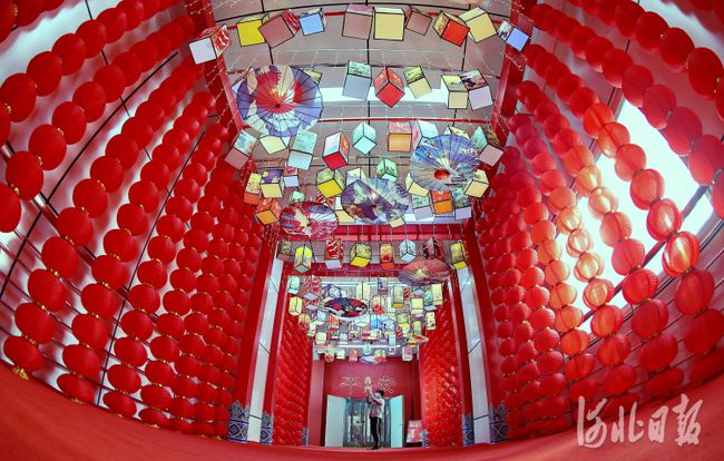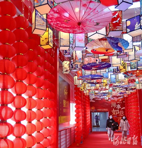 2022年2月9日,位于河北省秦皇岛市海港区北环路街道的世纪港湾购物广场内,市民在购物广场内一处走廊游玩。 近日,河北省秦皇岛市海港区多家商场内布置灯笼等装饰品,红红火火喜迎元宵佳节。 河北日报通讯员曹建雄摄影报道