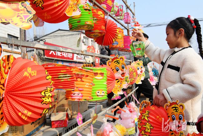 2022年2月9日,在河北省邯郸市广平县小张固村集市上,小朋友在选购带有“虎”元素的灯笼。元宵佳节临近,该县市场上各类带有“虎”元素的灯笼格外俏销。河北日报通讯员程学虎摄影报道