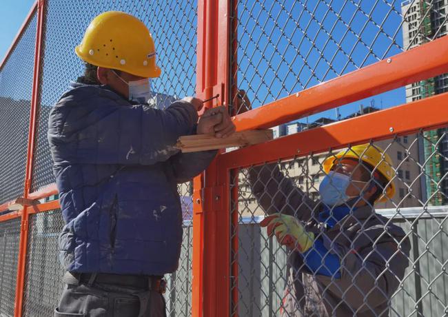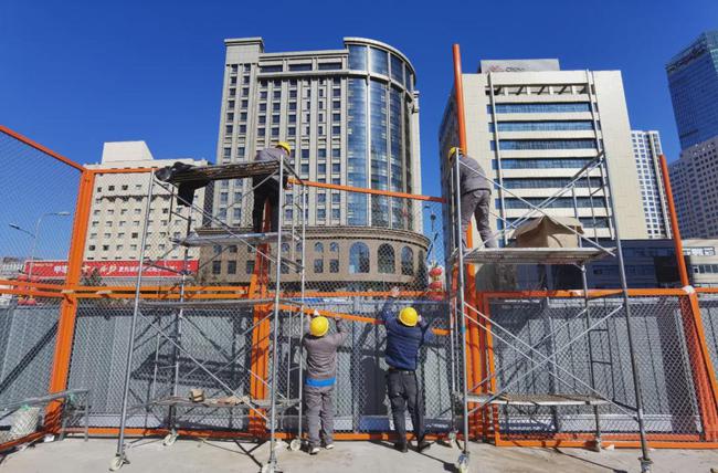 中山路与平安大街交口东南角附近,施工人员正在安装围网框架。