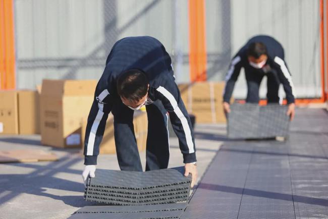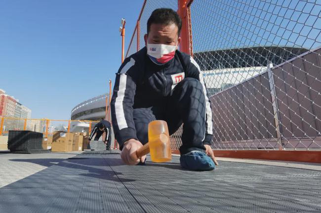 14时30分许,在裕彤国际体育中心西广场,多位施工人员正在紧锣密鼓地铺设悬浮式拼装地板,这里将建成一个标准篮球场。环顾该篮球场四周,围网框架及灯光早已安装完毕。负责铺设地板的工作人员介绍,他们铺设的地板为高规格专业地板,在防滑性能和安全性能及耐候性方面表现优异,球场建成后,广大市民可以放心而舒适地打篮球健身。