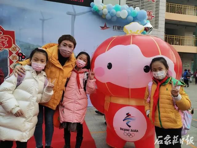 在中山路小学校门口,冰墩墩、福虎迎接学生返校归来